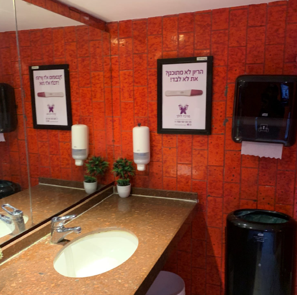 We blijven creatieve manieren vinden om vrouwen met ongeplande zwangerschappen op de hoogte te brengen van onze hulp. Naast advertenties op de zijkanten van 330 bussen in het hele land, hangen we advertenties op de toiletdeuren van 100 cafés, restaurants en koffiehuizen op de promenade van de toeristische stad Eilat.